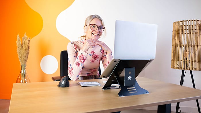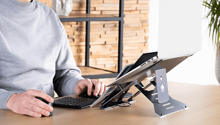 Coloque el soporte a una altura tal que la pantalla quede a la altura de los ojos o ligeramente por debajo. De este modo, adoptarás automáticamente una postura erguida. Nota: utilice siempre un teclado y un ratón distintos para trabajar de forma ergonómica.