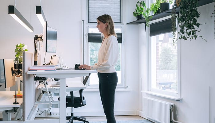 Cambiando regularmente de postura durante la jornada laboral, estimulas la circulación sanguínea y previenes dolencias físicas. Basándose en el uso real de la pantalla, el módulo Sit-stand coach controla tu escritorio de sentado a de pie o a una altura intermedia (para utilizar un taburete de pie o una bicicleta de escritorio). Puedes fijar tus descansos personalmente y programar tu escritorio eléctrico* para que suba o baje a la altura que elijas.