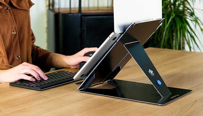 Coloque el soporte a una altura tal que la pantalla quede a la altura de los ojos o ligeramente por debajo. De este modo, adoptarás automáticamente una postura erguida. Nota: utilice siempre un teclado y un ratón distintos para trabajar de forma ergonómica.