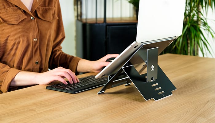 Coloque el soporte a una altura tal que la pantalla quede a la altura de los ojos o ligeramente por debajo. De este modo, adoptarás automáticamente una postura erguida. Nota: utilice siempre un teclado y un ratón distintos para trabajar de forma ergonómica.