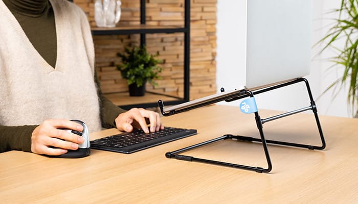 El Soporte para Portátil de Oficina R-Go es ideal para el puesto de trabajo fijo. Este soporte eleva tu portátil hasta una altura de visión cómoda, permitiéndote trabajar en una postura erguida.